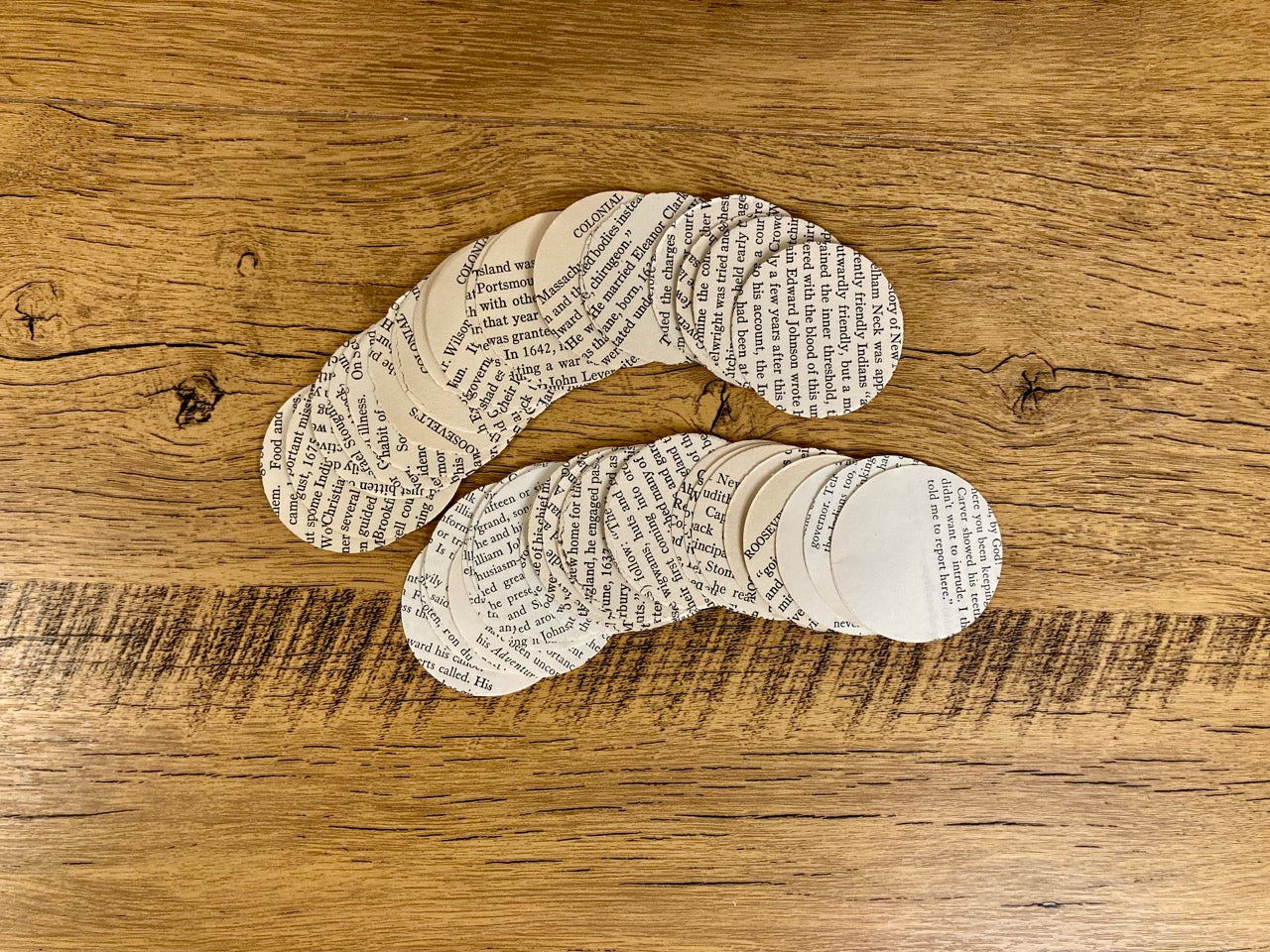 50 pieces of 2in circles made from vintage text only paper
