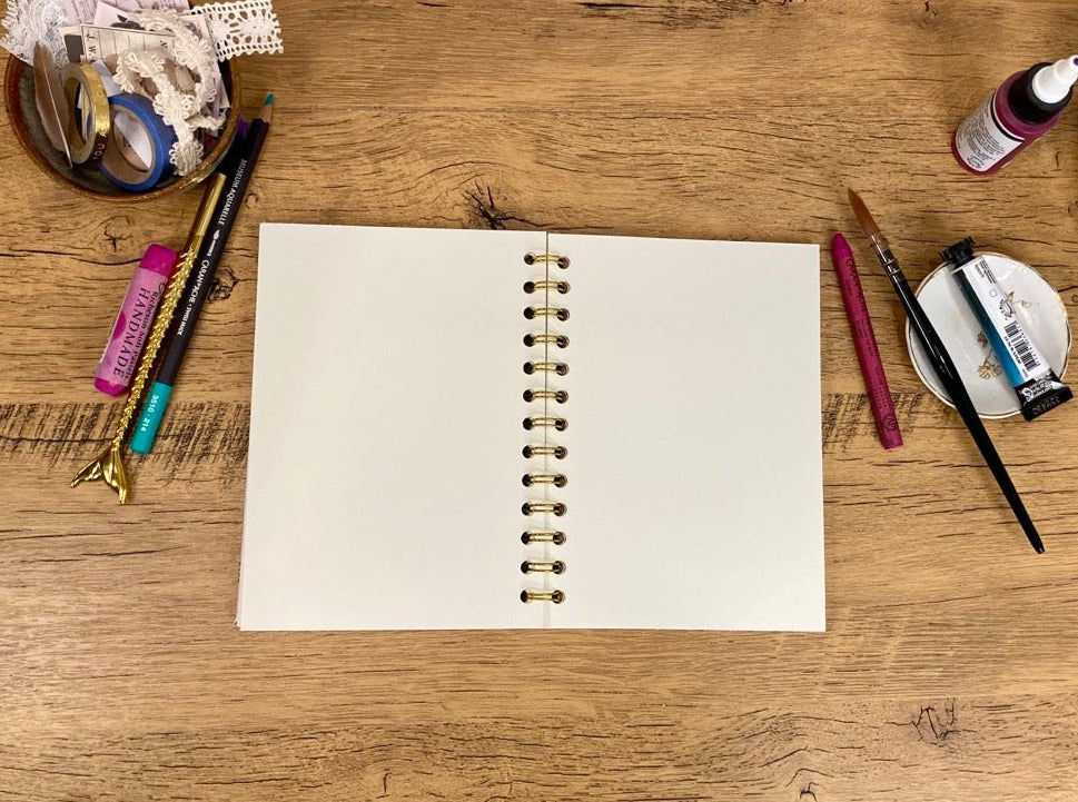 This small 5x7 wire-bound watercolor journal is perfect for the artist looking for a creative and cute way to express themselves. With its light pink floral cover and gold metallic embossing, it is easy to express your beautiful ideas in style. Get your creative juices flowing with this adorable journal!