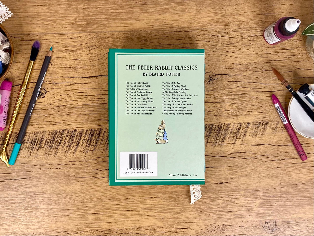 Hardcover, children's altered-book: The Tale of Peter Rabbit, Beatrix Potter, inside cover with original Peter Rabbit book paper