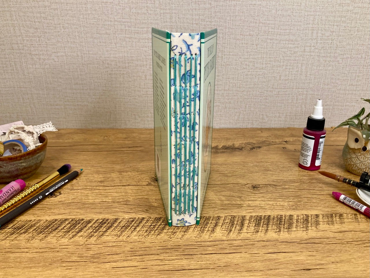 Lay flat custom spine, hand-sewn with the chain stitch method using mint green embroidery thread through double layered white with blue floral pattern cotton fabric spine, 5/8 inch lace cotton ribbon bookmark