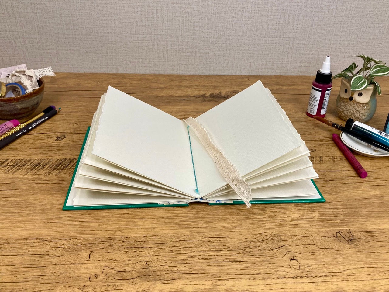 This small altered book is the perfect journal for creative exploration! This watercolor journal contains 40 pages of 140lb paper and comes with a lay flat hand-sewn spine, hardcover, and bookmark. Perfect for any watercolor or mixed-media artist!