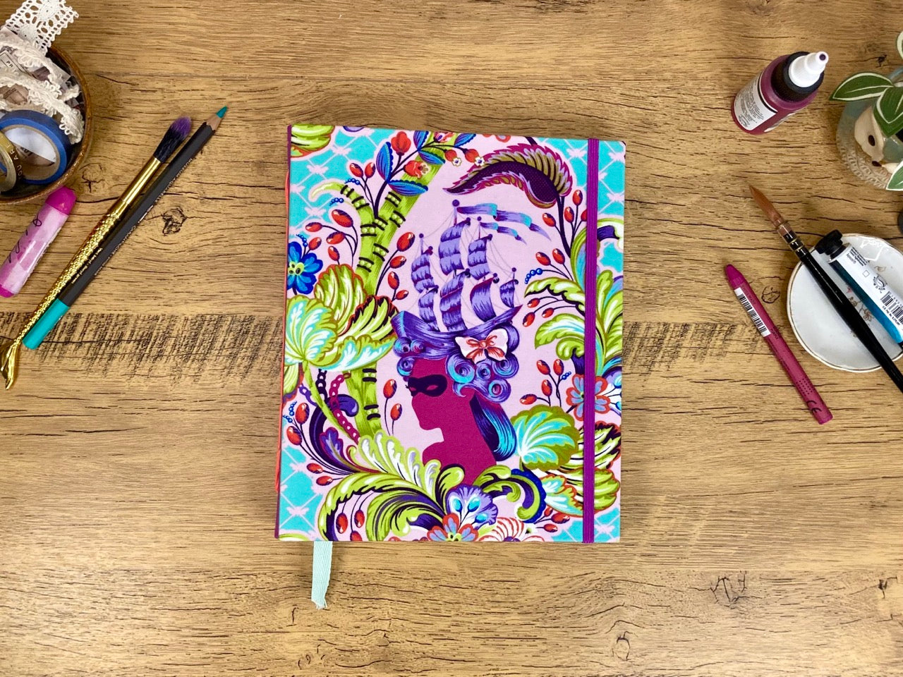 Hardcover, 70pt chipboard covered with Tula Pink, Marie Antoinette Seaside Couture fabric treated with fine art wax sealant, inside cover with teal pattern scrapbook paper, 1/4 inch wide pink elastic journal closure secured through metal eyelets on the back cover