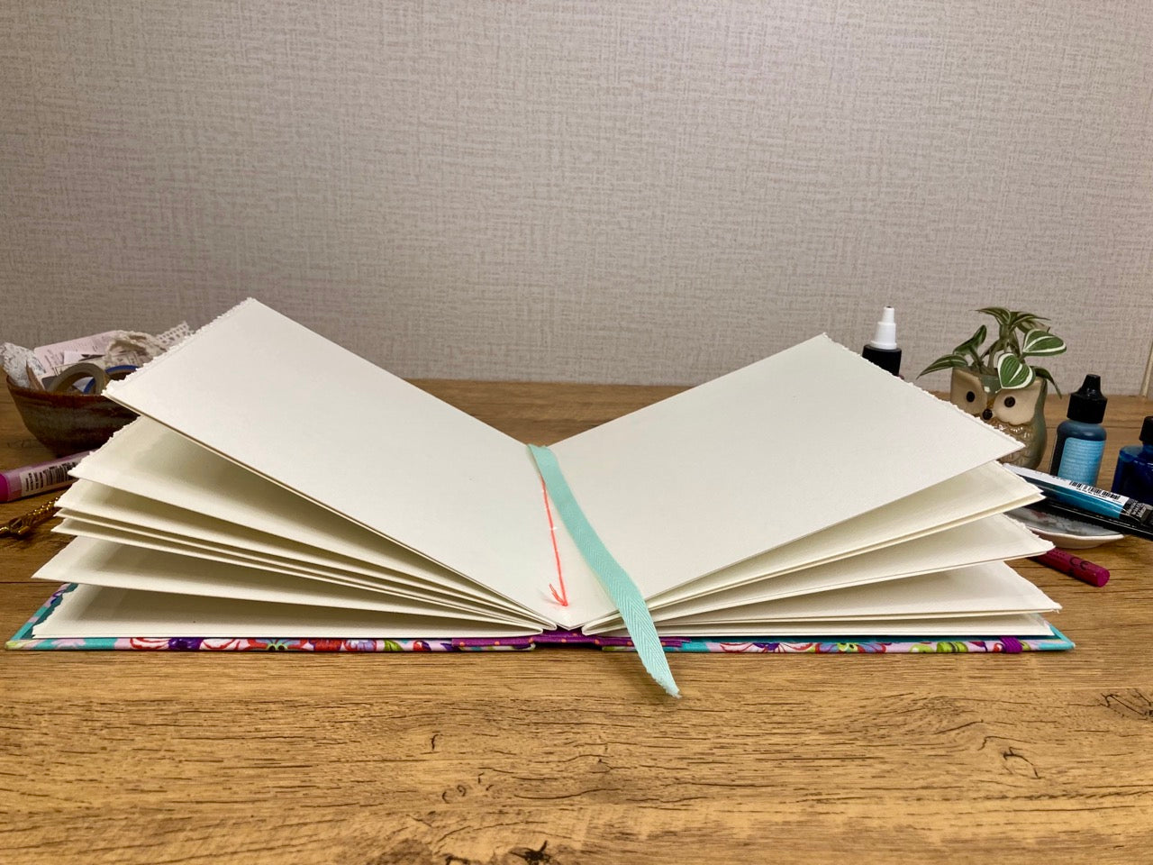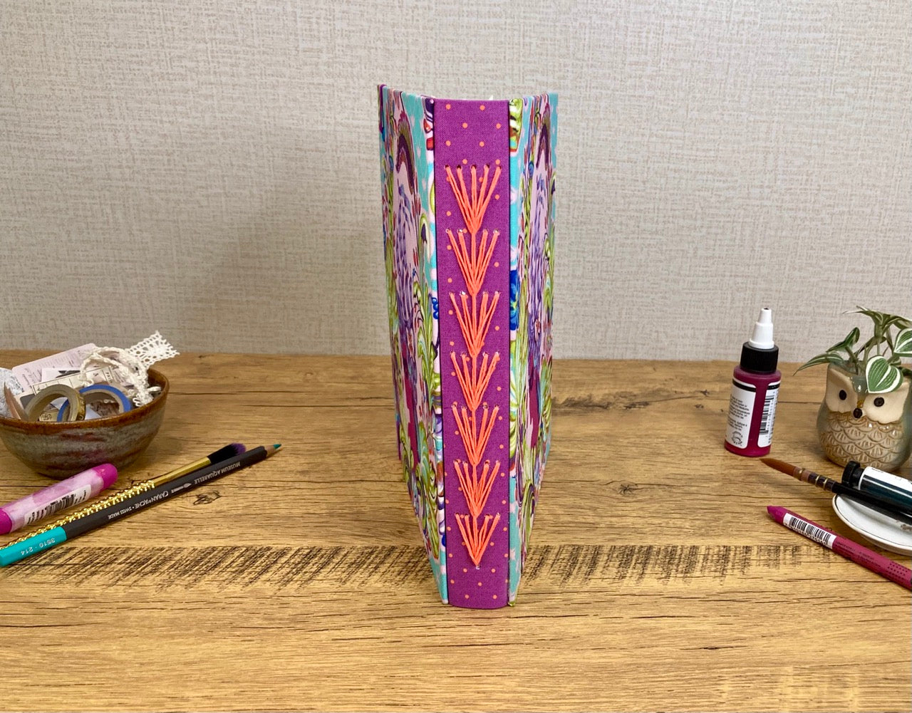 Lay flat custom spine, hand-sewn with custom design chain stitch method using neon coral embroidery thread through double layered pink with polka dot cotton fabric spine, 3/8 inch cotton ribbon bookmark