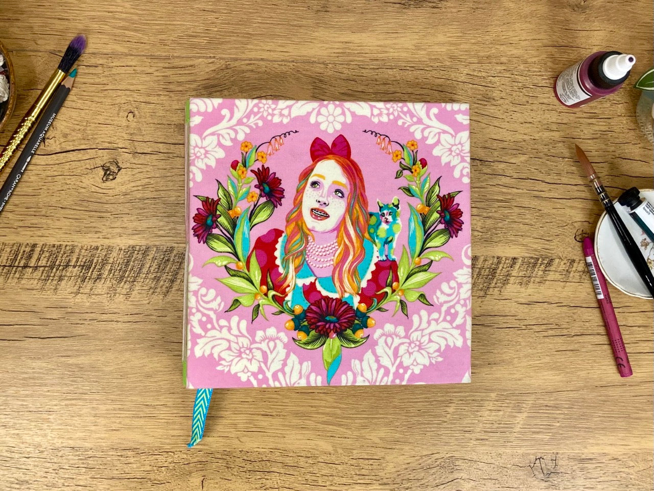 Hardcover, 70pt chipboard covered with Tula Pink, pink Alice, Curioser and Curioser fabric treated with fine art wax sealant, inside cover with multi-color floral pattern scrapbook paper