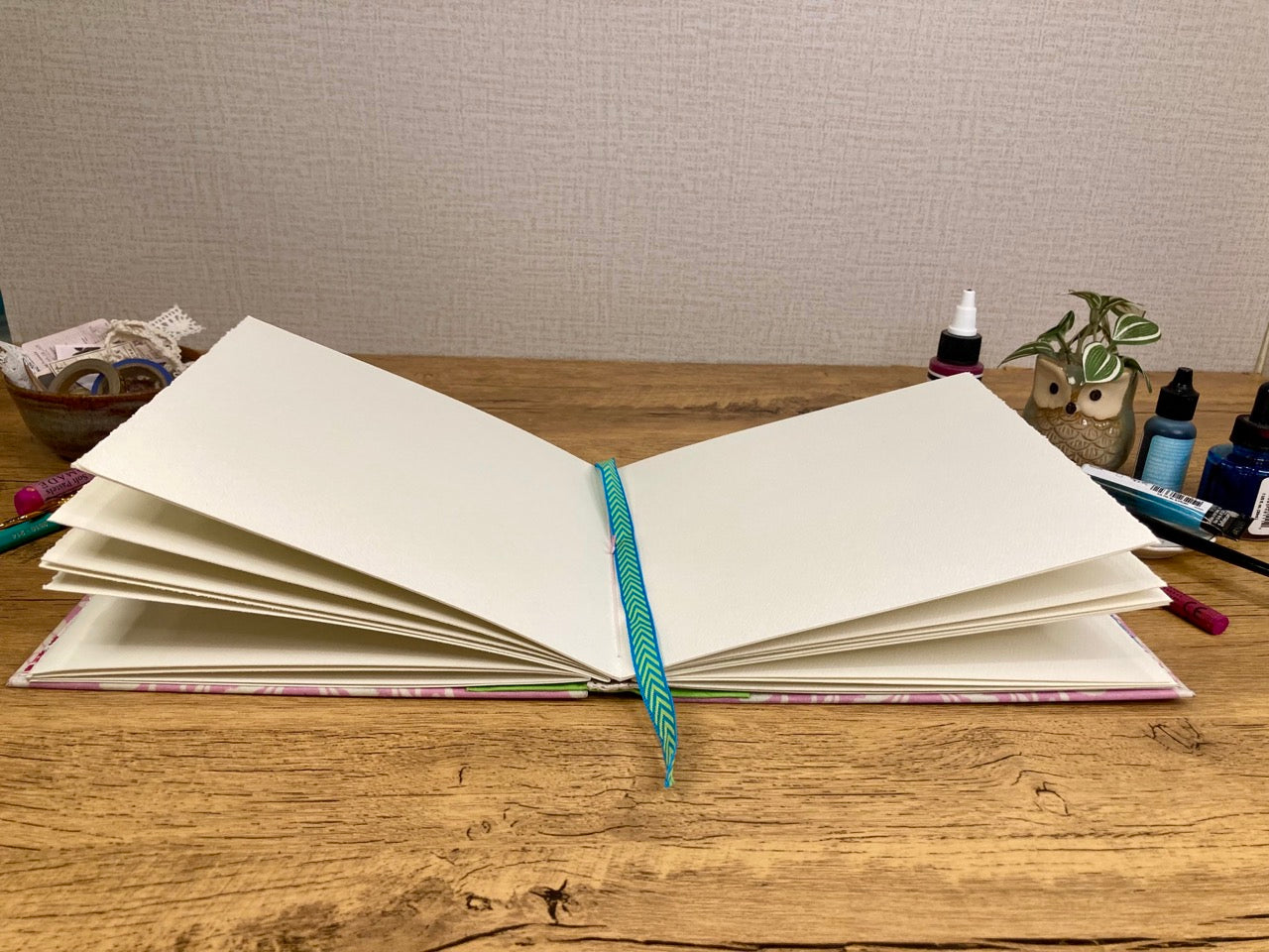 Lay flat custom spine, hand-sewn with pamphlet stitch method using variegated pink embroidery thread through double layered light green cotton fabric spine, 3/8 inch blue/green pattern satin ribbon bookmark