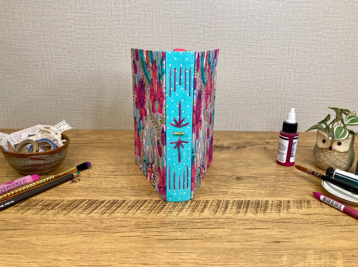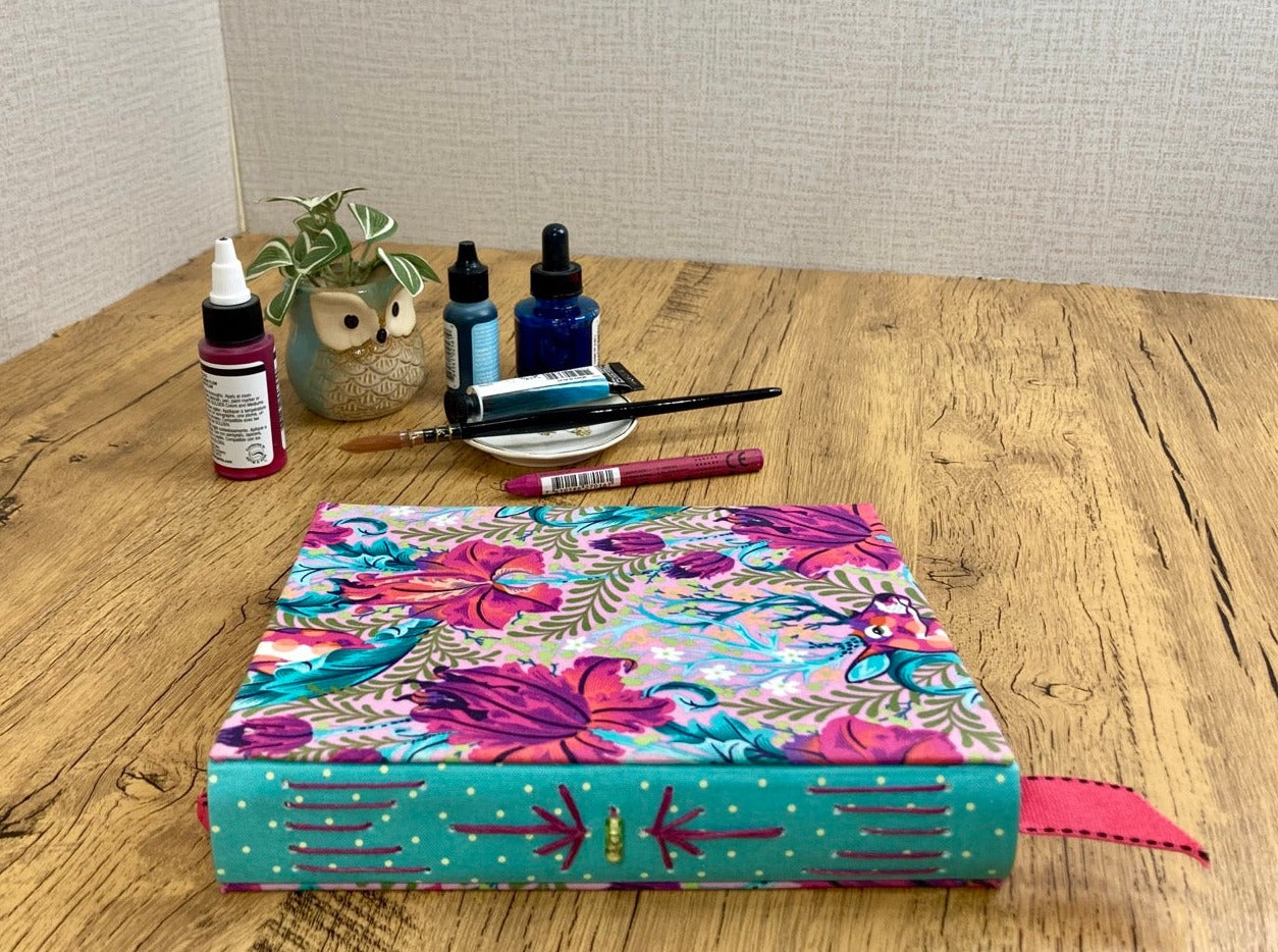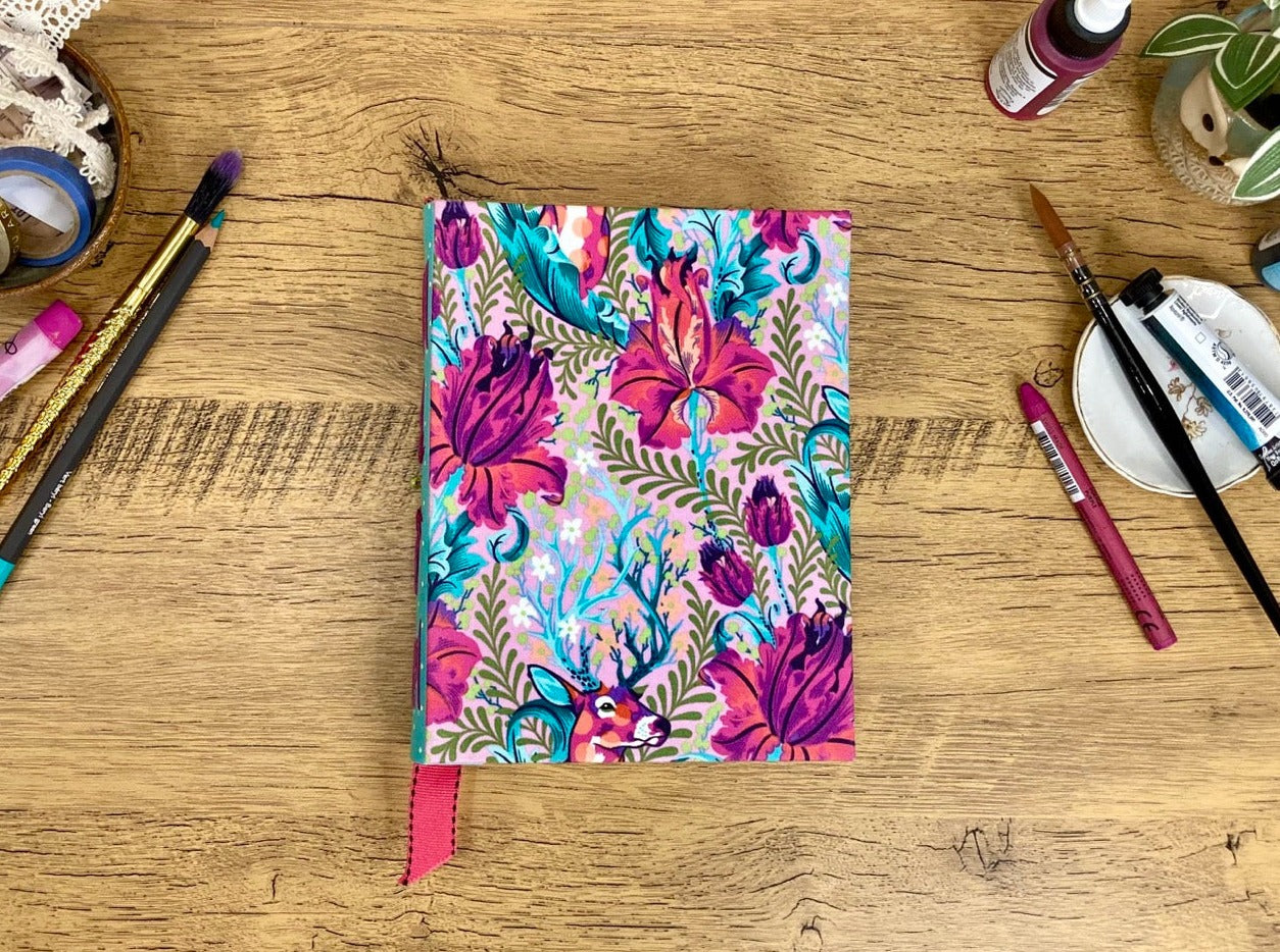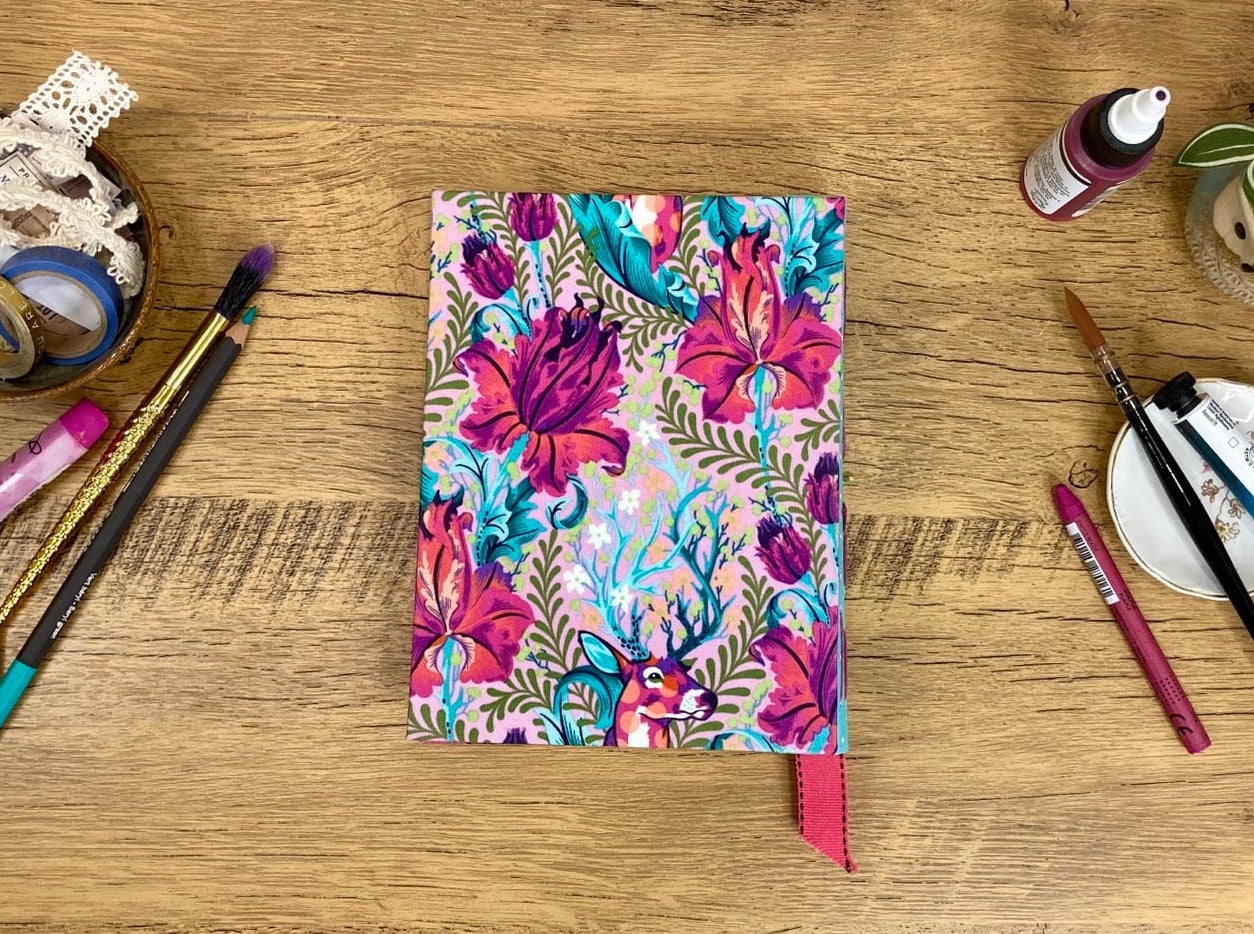 Hardcover, 70pt chipboard covered with Tula Pink, pink floral deer fabric treated with fine art wax sealant, inside cover with pink floral pattern scrapbook paper