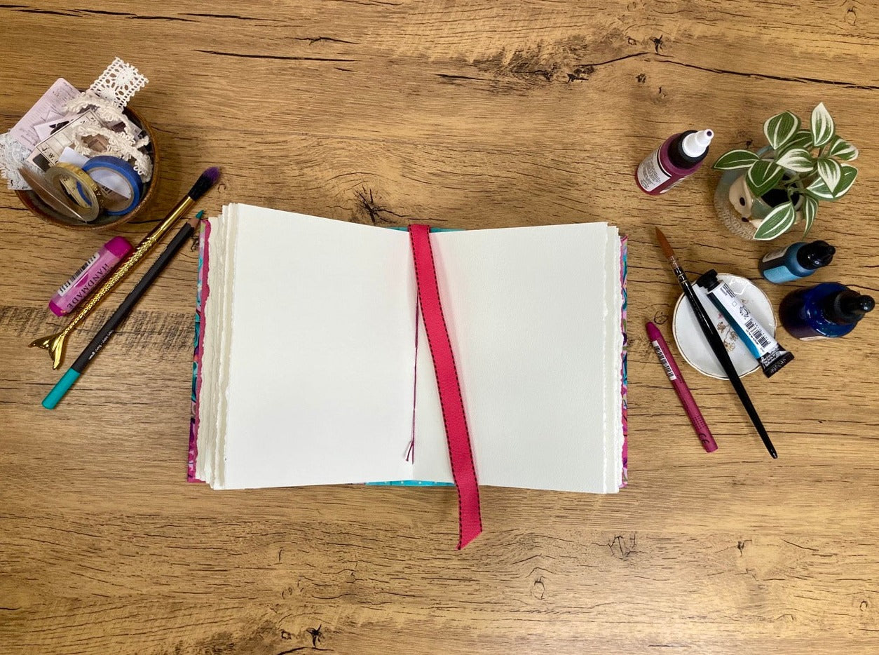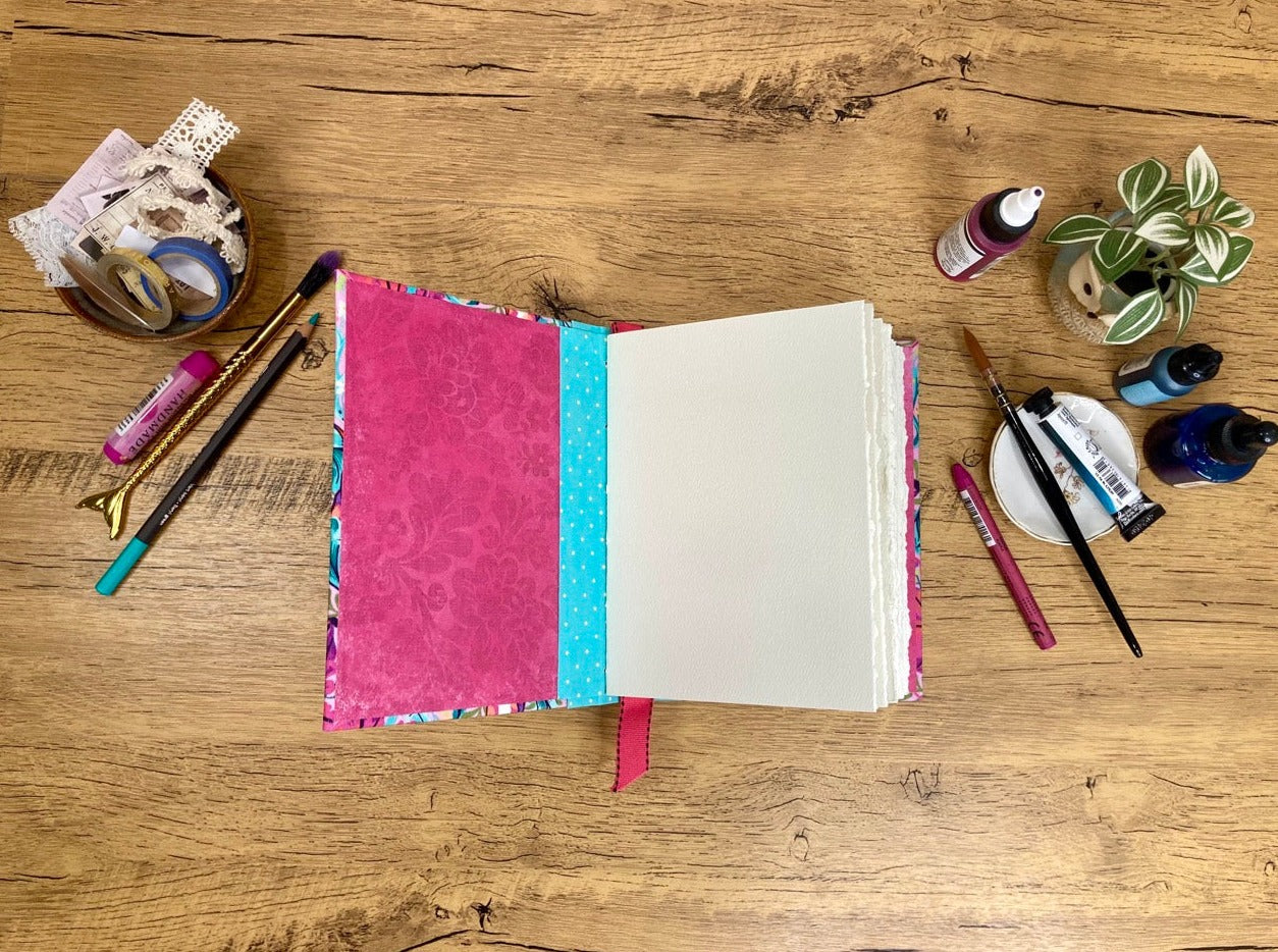 This small handmade watercolor journal is made with a pink deer design and has a cotton bookmark. It's the perfect companion for your creative projects with a sturdy paper that's inspiring and ready to go. Unleash your creativity with this journal!